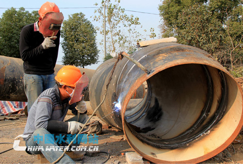 焊接工人對繁昌縣長江引水改造擴(kuò)建工程渾水管道進(jìn)行焊接作業(yè)
