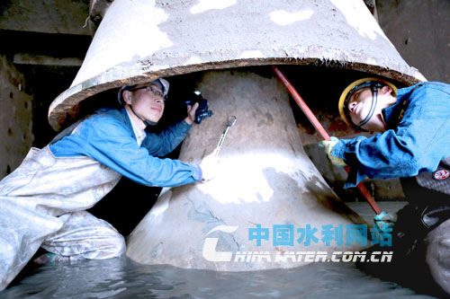 安徽省潁上縣水務(wù)局近日組織開展37座國(guó)有泵站設(shè)備故障排除和維修保養(yǎng)工作,確保泵站在防汛排澇中充分發(fā)揮效益。圖為新長(zhǎng)林排澇站技術(shù)人員在對(duì)水下喇叭口進(jìn)行檢查。(本報(bào)通訊員 王林洪/攝)