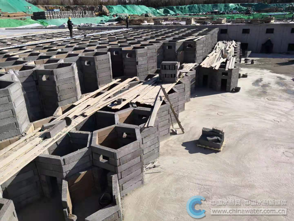 該工程作為2020年北京市重點(diǎn)民生工程,植入了低影響開(kāi)發(fā)設(shè)計(jì)理念,采用了硅砂蜂巢凈化系統(tǒng)工藝,實(shí)現(xiàn)了湖水的凈化與調(diào)蓄。集團(tuán)公司龍?zhí)段骱?xiàng)目在硅砂磚砌筑過(guò)程中,跳出了以往砌筑需要搭設(shè)腳手架的慣性思維,創(chuàng)造性地采用臺(tái)階法砌筑,每層臺(tái)階高1.2米,根據(jù)砌筑的總高度,選擇臺(tái)階層數(shù)。在每層臺(tái)階砌筑到要求高度后,在硅砂磚上面滿鋪?zhàn)鳂I(yè)板,作為砌筑上一層臺(tái)階的作業(yè)平臺(tái),增加了施工作業(yè)面,從而形成流水施工,提高了施工效率。硅砂磚的運(yùn)輸采用汽車吊、叉車和抓磚機(jī)。并且為了增加硅砂磚的整體強(qiáng)度,每塊硅砂磚一端預(yù)留凹口,一端預(yù)留凸口,在砌筑中形成凹凸咬合,自然形成正六邊形的孔口結(jié)構(gòu),層與層之間采用M10砂漿作為粘結(jié)材料,孔口與孔口相鄰而砌,最終形成蜂巢形狀的過(guò)濾系統(tǒng)。
