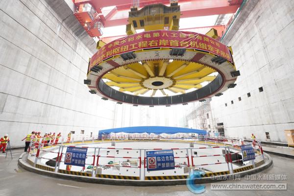 4月24日10時,大藤峽工程右岸首臺發(fā)電機組定子啟動吊裝,經(jīng)過近一個小時的精心施工,定子準確到達1#機基坑預定位置。
