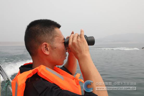 王快庫區(qū)周邊,有5個鄉(xiāng)鎮(zhèn),20多個村,約3萬人。巡查隊員說,他們一方面制止違法違規(guī)行為,一方面還肩負著普法宣傳任務,為的就是保護好這一池清水,保護好水利工程,保護好人民群眾生命財產(chǎn)安全。圖為52歲的水政監(jiān)察大隊隊長蔡保義在船上用望遠鏡瞭望觀察。