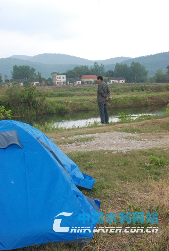 24日省防指再次派出督辦組,召集相關(guān)鎮(zhèn)領(lǐng)導(dǎo)和縣市防辦負(fù)責(zé)人一起從惠亭水庫灌區(qū)渠首開始督辦。在京山第61個(gè)剅管號,小小的藍(lán)色臨時(shí)帳篷闖入眼簾,里面被褥、枕頭、礦泉水一應(yīng)俱全,值守人員蓬著頭發(fā)正在關(guān)閉的閘門附近徘徊。他介紹,他的任務(wù)就是看好關(guān)閉的閘門,防止被農(nóng)民偷偷打開,做好前來質(zhì)問的農(nóng)民的解釋工作。白天在附近轉(zhuǎn)轉(zhuǎn),夜里在小帳篷里將就著睡,三餐都由惠亭水庫安排人送來。像這樣24小時(shí)值守在關(guān)閉的剅口閘邊的,惠亭水庫安排了十多人。