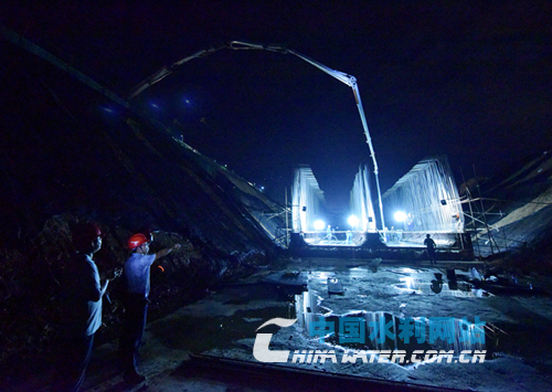 天色漸黑,瓦藍(lán)的天空把工地映得壯美如畫。來到深坑,十幾個工人正在緊張操作,有的手扶自上垂直而下的混凝土泵管,一格一格地有序澆注;有的手持振動棒,一格一格地把混凝土搗振到位。萬丈高樓平地起。代平玉說:暗涵寬4.5米、高5.5米,以后丹江來的水就從這里流過,確保滴水不漏,混凝土澆筑質(zhì)量至關(guān)重要。今天澆筑的底板厚80公分,每節(jié)長15、寬11.3米,每倉澆筑需要混凝土170方。工程部副主任李軍營說:目前已成型的雙孔暗涵33個495米,頭天晚上我們澆了旁邊23倉的頂板,今天繼續(xù)加班澆底板。從太原理工大學(xué)水利水電學(xué)院畢業(yè)不久的郭剛像上陣的新兵,緊張而興奮,他的職責(zé)就是盯倉,負(fù)責(zé)查看混凝土布料厚度、振搗、后期的立墻鋼筋復(fù)位及收面等關(guān)鍵關(guān)環(huán)節(jié),守在工地一絲不茍。