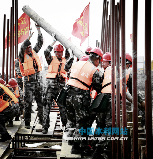 武警部隊(duì)?wèi)?zhàn)士進(jìn)行人工封堵決口演練(夏晶 攝)