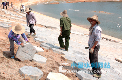 參加水庫除險加固的農(nóng)民黃建申(右一)樂呵呵地說:“今后汛期可以睡上安穩(wěn)覺了!”