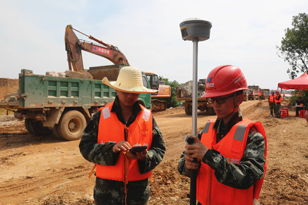 29歲的廖柏輝和26歲的羅嗣陽是搶險現場的測量員,每日將精密的儀器扛上肩頭,行走在滿是泥土的河堤上,實時監(jiān)測水位及測量推進距離等重要數據,并報告指揮中心,用數據為搶險開進提供有力支撐。