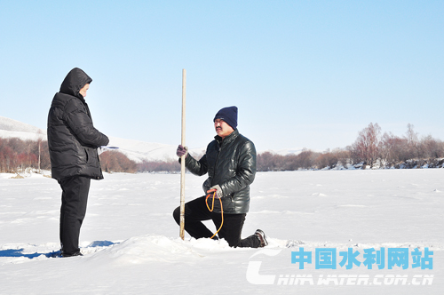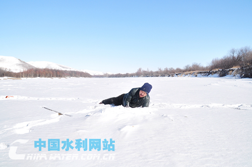 天寒地凍,哈氣成冰。在鑿冰孔過(guò)程中,三位職工的褲子濺滿了河水,瞬間凍結(jié)成了冰花鎧甲,眉毛胡子上也掛滿了冰霜。由于冰層較厚,按照規(guī)定,需開(kāi)鑿8個(gè)冰孔才能滿足測(cè)流要求,每個(gè)冰孔深度為60—70厘米,勞動(dòng)強(qiáng)度很大。在不方便站立的地方,還得趴在雪地上作業(yè)。因?yàn)楸鶎虞^厚,所以每一個(gè)冰孔鑿起來(lái)都十分辛苦。于是,三個(gè)人輪換著交替進(jìn)行。不一會(huì)兒,他們戴在頭上的帽子就被甩掉了,臉上流淌著汗水,頭上冒著熱氣。這個(gè)平均年齡已經(jīng)超過(guò)50歲的小集體,干得熱火朝天。