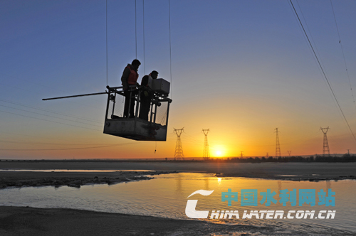 巴彥高勒水文站職工乘坐吊箱進(jìn)行凌汛測(cè)驗(yàn) 龍虎攝