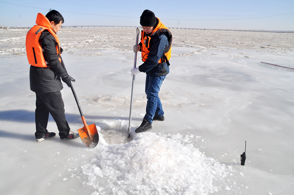 冷酷的嚴(yán)冬將冰面凍得堅(jiān)硬,冰層厚達(dá)55厘米左右。光溜溜的冰面在陽(yáng)光的照射下,不僅沒(méi)有融化的跡象,反而映射出刺目的光。李軍嘆道:“這冰可不好打!”說(shuō)完,他用力揮舞著冰镩鑿擊冰面,冰塊四處飛濺。侯寶柱彎著腰,手持鐵锨,將碎冰碎屑鏟出來(lái)。一鑿一鏟間,冰孔慢慢形成,河水“咕咚咕咚”漸漸冒出來(lái)了。此時(shí),沾了水的冰更難打,需要用更大的力氣、更快的速度穿透,才能打開(kāi)一個(gè)窟窿。一個(gè)冰孔接著一個(gè)冰孔,李軍不斷鑿孔,侯寶柱不停鏟冰,張健嫻熟地操作測(cè)驗(yàn)儀器并記錄數(shù)據(jù)。大家互相協(xié)助,輪流作業(yè),花費(fèi)近3個(gè)小時(shí),終于完成測(cè)驗(yàn)工作。他們拿著工具離開(kāi)時(shí),身后斷面上留下23個(gè)冰孔。