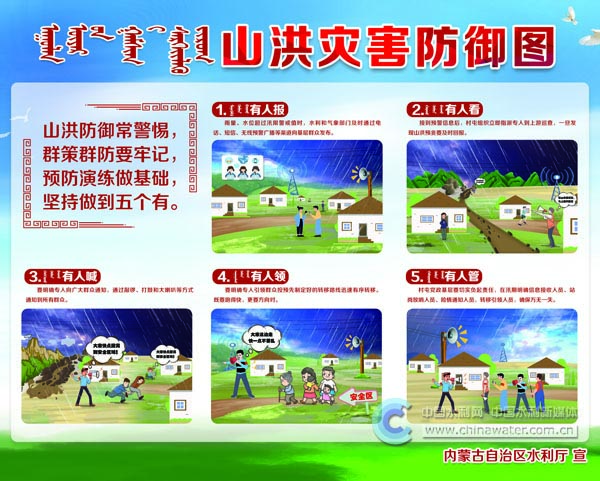 《山洪災(zāi)害防御圖》把防山洪要點(diǎn)以文字和圖畫(huà)方式繪于一圖,便于村屯墻頭張貼,使防山洪要點(diǎn)一目了然,為山洪預(yù)警預(yù)報(bào)和群眾安全轉(zhuǎn)移提供了直觀、簡(jiǎn)明、易懂、易記的范本。據(jù)了解,內(nèi)蒙古自治區(qū)水利廳編制的這張《山洪災(zāi)害防御圖》是目前全國(guó)針對(duì)山洪災(zāi)害預(yù)警的首張圖表。