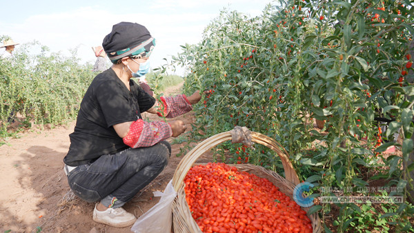 在位于同心縣河西鎮(zhèn)同德村的潤德萬畝枸杞基地,數(shù)以百計的工人正在田間忙著采摘枸杞。田間的枸杞采摘工均是來自同德村的移民群眾。這里原本是一片荒灘,正是有了黃河水的澆灌,才開發(fā)出這一大片郁郁蔥蔥的枸杞田園。公司流轉(zhuǎn)土地7500畝,在同德村建立了枸杞基地,每年每畝支付給村民的土地租金是600~900元,另外一名采摘工一天可以掙得120~150元,采摘高峰期每天用工量在6000人左右。