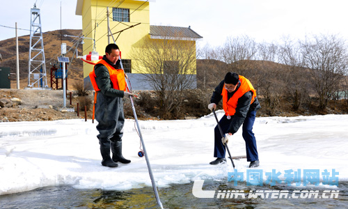 踩著腳下銀白色的冬霜,三個人來到距水文站房西邊200米處的水文站測流斷面,“河面又封凍了,老趙你去拿鋼釬,老安去取水樣盆……”,38歲的水文站站長趙永斌邊麻利地穿上安全服和橡膠褲邊給兩位同事布置工作。一切準(zhǔn)備就緒,身材壯實的趙永斌首先掄起20斤重的鋼釬使勁砸向厚實的冰面,“咚、咚、咚……”,脆的撞擊聲劃破清晨的寧靜,在北川河谷久久回響。