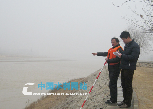 大年初五,梁山河務(wù)局趙堌堆管理段職工冒雨觀測河勢和凌情
