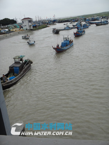 大治河東水閘外河漁船進港避風。