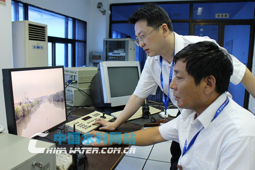 水閘值班人員通過視頻監(jiān)控系統(tǒng)巡查上下游排澇情況。
