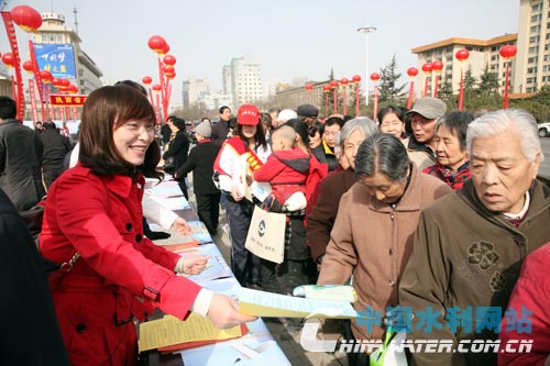 在宣傳現(xiàn)場(chǎng),西安郵電學(xué)院師生組成的志愿者不斷向過(guò)往的行人散發(fā)節(jié)水宣傳單,并舉行了隆重的宣誓儀式,決心從現(xiàn)在做起,從點(diǎn)滴做起,珍惜水,節(jié)約水,保護(hù)水。陜西省漁業(yè)局在現(xiàn)場(chǎng)向過(guò)往市民發(fā)放觀賞金魚(yú),喚醒廣大民眾保護(hù)漁業(yè)資源。與此同時(shí),陜西省積極參加水利部在北京舉辦的“世界水日”“中國(guó)水周”紀(jì)念宣傳活動(dòng),選派優(yōu)秀文藝節(jié)目參加了水利部組織的《水利“六五”普法啟動(dòng)儀式暨水利法制宣傳文藝會(huì)演》活動(dòng),一曲“天下黃河九十九道彎”贏得了水利部領(lǐng)導(dǎo)和普通觀眾的好評(píng)。