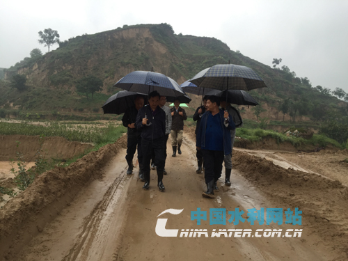 8月26日下午,國家防總工作組一行會同當?shù)厥、縣工作人員,冒雨查看榆林市橫山區(qū)八道溝淤地壩。