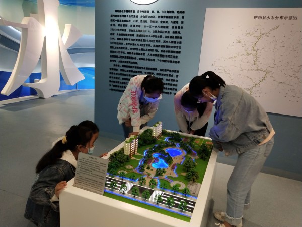 “我們這個展廳以‘認(rèn)識水、了解水、節(jié)約水、保護(hù)水’為主題,主要從水的循環(huán)、水資源現(xiàn)狀、缺水帶來的危害、自來水的形成,污水處理利用、節(jié)約用水知識,海綿城市、節(jié)水器具展示等方面,通過實(shí)物展示、光電演示、互動教學(xué)、親身參與等方式,來宣傳節(jié)水知識,傳播節(jié)水理念,讓同學(xué)們在有趣的游戲中了解水,認(rèn)識水,學(xué)會從點(diǎn)點(diǎn)滴滴節(jié)約用水、愛惜水、保護(hù)水!标汤蚱歼呑哌吔榻B:“這是略陽縣水系分布圖、這是海綿城市示意沙盤、這是節(jié)水器具、這是孩子們做的節(jié)水手抄報(bào)……”