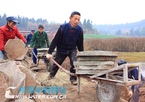 中國(guó)水利網(wǎng)韓1月8日訊 1月8日,在四川省遂寧市安居區(qū)橫山鎮(zhèn)朝天村,村民們正在用“雞公車(chē)”人力轉(zhuǎn)運(yùn)修建山坪塘所需的六菱塊,忙著修建整治村里的山坪塘。