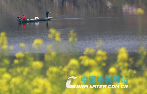 3月25日,在渠江四川省華鎣市明月段,漁民乘一葉扁舟在如詩如畫的春江水中捕魚。陽春三月,春意正濃。碧綠的春江水倒映著岸邊的菜花,使渠江變得分外美麗。(邱海鷹 攝)