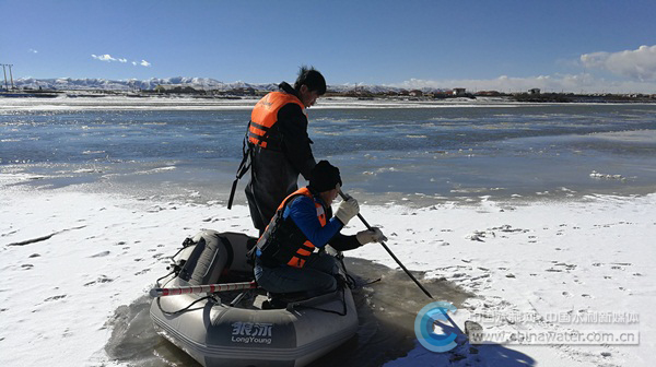 9時,天空飄著雪花,寒風(fēng)刺骨。年過五旬的站長黨連學(xué)帶領(lǐng)幾名職工,拿上量冰尺、鋼釬、測深桿、流速儀等水文測驗(yàn)儀器,前往河道斷面開始冰期測驗(yàn)工作。