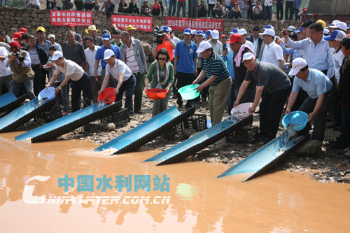 上午10時(shí),在興縣黑峪口村,一輛滿載魚苗的貨車?吭邳S河岸邊。距離車輛停靠位置不到5米處,8條橡膠放流槽一字排開固定在岸邊。上午10時(shí)30分,隨著省水利廳副廳長、省干部駐村幫扶工作隊(duì)駐興縣大隊(duì)長白小丹宣布“2016年山西省黃河興縣段水生生物增殖放流活動(dòng)開始”,參加活動(dòng)的省、市、縣有關(guān)部門相關(guān)領(lǐng)導(dǎo)一同手捧鯉魚苗,盆口翻側(cè),20余厘米長的魚苗隨即沿放流槽滑入河中。隨后,在場(chǎng)的漁正管理人員、省干部駐村幫扶工作隊(duì)駐興縣隊(duì)員、第一書記和當(dāng)?shù)剞r(nóng)民代表近100余人也紛紛捧起放生盆,將魚苗投入河中。