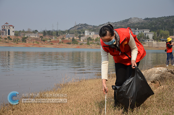 志愿者和水政監(jiān)察人員一起在花山水庫開展清水活動