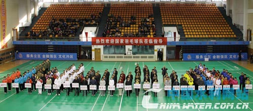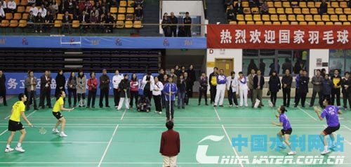 國家羽毛球隊隊員徐晨、張楠與水利職工進行男雙表演賽
