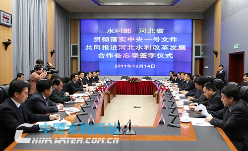 中國(guó)水利網(wǎng)站訊 (記者 席晶 通訊員 姚葳)12月14日下午,水利部與河北省人民政府在京簽訂《貫徹落實(shí)中央1號(hào)文件共同推進(jìn)河北水利改革發(fā)展合作備忘錄》。簽字儀式前,水利部黨組書記、部長(zhǎng)陳雷與河北省委書記張慶黎,省委副書記、代省長(zhǎng)張慶偉座談。