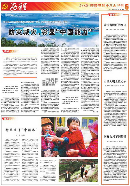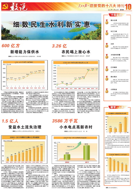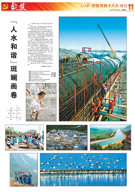 盛世治水譜華章,興水惠民鑄輝煌。為迎接黨的十八大召開,全面展示黨的十六大以來水利改革發(fā)展的輝煌成就,人民日報提前策劃、精心組織“迎接黨的十八大”水利特刊。部領(lǐng)導(dǎo)高度重視,周密部署,精心指導(dǎo),辦公廳牽頭負責(zé),新聞宣傳中心、水利報社會同部機關(guān)各司局密切配合,提供了大量內(nèi)容詳實、豐富鮮活的典型素材,部有關(guān)直屬單位、有關(guān)省市水利廳局全力支持配合。9月20日,凝聚了人民日報編輯記者心血和汗水的“迎接黨的十八大”水利特刊濃墨重彩推出,特刊從“巨變”、“歷程”、“風(fēng)采”、“啟示”、“使命”等多個角度,共8個整版(可點擊圖片顯示)21篇文字稿、34幅圖片圖表,多角度、全方位展示了十年來水利事業(yè)取得的輝煌跨越,喜慶熱烈,圖文并茂,氣勢恢宏,給人以強烈的震撼。現(xiàn)將特刊展示如下: