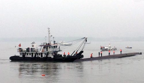 6月2日,救援船只在沉船現(xiàn)場對“東方之星”輪(黑色物為其船底)展開營救。(圖片來源:新華社)