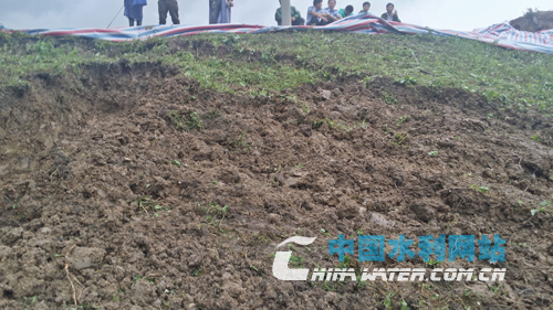 塌方處表面的泥土與生長(zhǎng)著矮草的大堤形成了鮮明對(duì)比(記者 張佳鑫 攝)