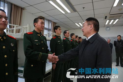 部黨組十分關(guān)心駐部武警戰(zhàn)士的工作生活情況,陳雷一行專程來到機(jī)關(guān)崗哨看望正在執(zhí)勤的駐部武警戰(zhàn)士,并來到戰(zhàn)士宿舍,與駐部全體武警戰(zhàn)士一一握手、噓寒問暖,關(guān)切詢問大家的工作、學(xué)習(xí)、生活情況。陳雷指出,駐部武警戰(zhàn)士們不畏嚴(yán)寒酷暑,忠于職守,晝夜執(zhí)勤,為保障機(jī)關(guān)正常運(yùn)轉(zhuǎn)和安全運(yùn)行作出了突出貢獻(xiàn)。他代表水利部黨組,向戰(zhàn)士們致以崇高敬意、表示衷心感謝并送上新春祝福。他勉勵(lì)戰(zhàn)士們認(rèn)真學(xué)習(xí)、刻苦訓(xùn)練、扎實(shí)工作,在新的一年里取得更大進(jìn)步。每逢佳節(jié)倍思親,陳雷叮囑有關(guān)司局負(fù)責(zé)同志,戰(zhàn)士們來自五湖四海,遠(yuǎn)離家鄉(xiāng)親人,要更多地關(guān)心駐部武警戰(zhàn)士,豐富他們的業(yè)余文體活動,讓戰(zhàn)士們度過一個(gè)溫暖、歡樂、祥和的新春佳節(jié)。