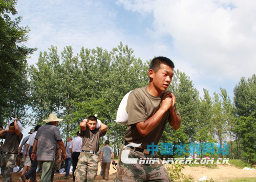 此時(shí)的險(xiǎn)工段,水情依然緊張。烈日灼烤下的搶險(xiǎn)現(xiàn)場(chǎng),戰(zhàn)士們正揮汗如雨加緊施工。固始縣縣長(zhǎng)王志學(xué)和縣水利局局長(zhǎng)郭森林一直“釘”在現(xiàn)場(chǎng)!拔覀兯械哪康闹挥幸粋(gè),就是一定要保證老百姓的生命安全!惫謱(duì)工作組堅(jiān)定地說(shuō)。