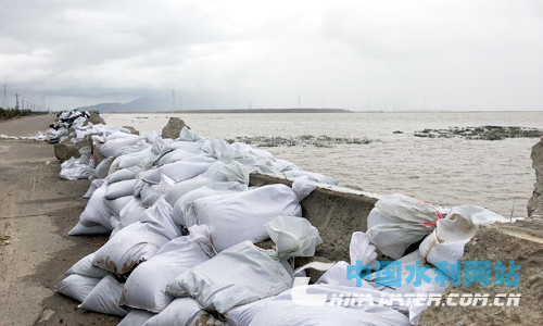 珠海市海堤被漁船撞毀后,管理部門用沙袋臨時(shí)搭起防浪墻 本報(bào)記者 陳瀟劍 攝