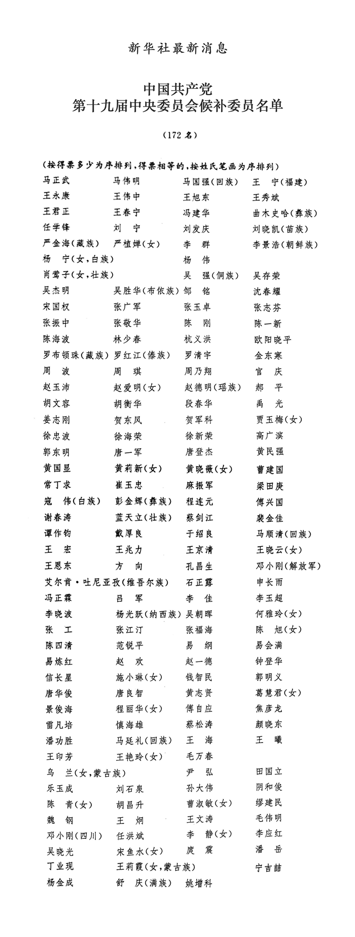 中國共產(chǎn)黨第十九屆中央委員會(huì)候補(bǔ)委員名單