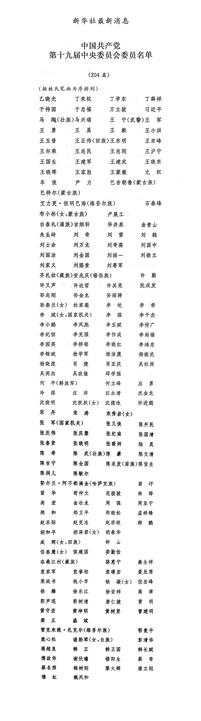 中國共產(chǎn)黨第十九屆中央委員會(huì)委員名單