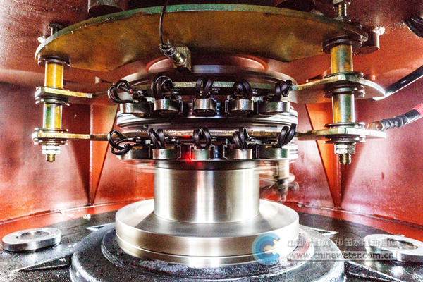 11月14日,淮安四站正在高速運(yùn)轉(zhuǎn)并接受工作人員檢測(cè)溫度(圖中紅色亮點(diǎn)為工作人員照射的探測(cè)光斑)的泵機(jī)軸承