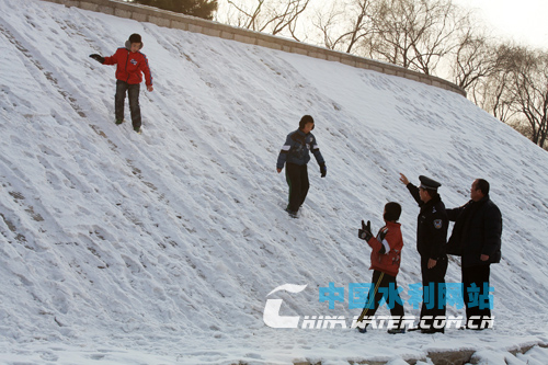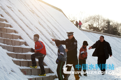 在這冰清玉潔、賞心悅目的景致里,人們打雪仗、堆雪人、踏雪痕,和美的畫面伴隨著滔滔東去的黃河。但令人擔心的一幕出現(xiàn)了,在被白雪覆蓋的濼口黃河險工壩坡上,幾位10多歲的少年,看到黃河險工上都是積雪,便把險工壩坡當成了“滑雪場”,樂此不疲的盡情玩耍起來。
