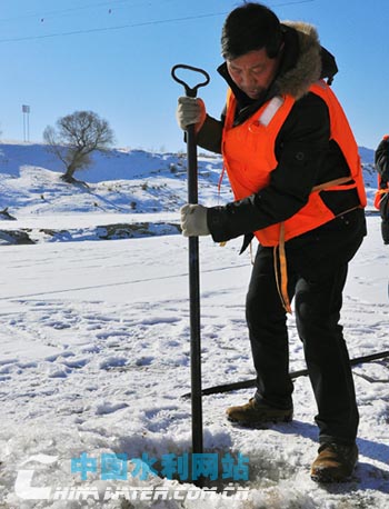 副站長(zhǎng)張瑞峰迅速用測(cè)具測(cè)出了水深、冰厚、冰花厚,然后把裝有鉛魚(yú)的流速儀放入冰孔測(cè)流。