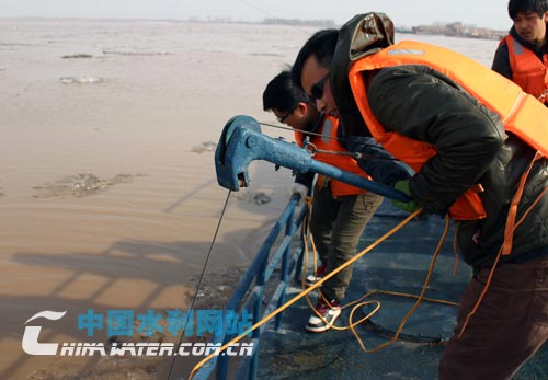 站在一邊的張志恒和曹江濤一上船就把流速儀安裝好,迅速把吊船索綁在測(cè)船上,測(cè)流正式開始。
