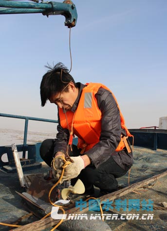 流速儀下水了,因?yàn)轳R達(dá)聲音太大,趙訓(xùn)宇幾乎要趴在船板上才能聽到流速儀發(fā)出的聲音。