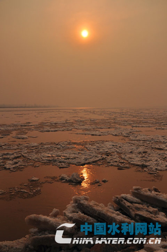 那是幾年前冬日的一個早晨,天剛剛發(fā)亮,我和同事們在黃河邊觀測凌情,發(fā)現(xiàn)黃河清三斷面附近河面有大量冰塊堆積,上游有大量冰塊隨水飄來,而下游河面依然冰封如故。河面靜悄悄的,只有河水的水位在悄悄地不斷上漲。冰封河面上界的冰塊越來越多、越積越高,眼看著一道小型冰壩已形成。我把觀測的情況急忙上報上級防凌值班室,而后繼續(xù)觀察。河水的水位繼續(xù)上漲,四五百米寬的河面一片白茫茫。在不足兩個小時時間里,河水水位上漲了一點五米,眼看著黃河水就要漫出河槽,緊張的氣氛似乎讓天也黯然起來。這時,阻水的冰壩發(fā)出了嘎支支的響聲,有些地方河水開始漫過冰壩流向下游,河里的水位依然在上升,突然,阻水的冰壩擋不住高漲的水的壓力而崩潰了,河面?zhèn)鱽砭薮蟮穆曧,河水猶如巨型猛獸在冰壩撕裂的缺口處沖向下游,冰封的河面頃刻間被沖開,隨后冰壩被全部沖垮并被狂怒的河水帶走,河面大量的冰塊沒地躲閃被奔流的河水沖擠得飛起來,高高的拋到河岸上或三四米高的控導護岸的頂部。洶涌的河水沖開了阻擋它的一切,義無反顧的奔向大海。水頭過后,河面恢復了平靜,水位也立馬降了下來,原來寬闊的冰封河面中間已是平靜的的水流,岸冰所剩無幾,而兩岸岸邊卻是一片狼藉,留下了一堆堆傾斜豎立的冰塊,冰壩形成的險情解除,黃河下游冰封的河面宣告已開河。