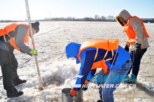 把早上的報(bào)文發(fā)出去之后,老職工路秉慧安裝好流速儀,準(zhǔn)備好救生衣、量冰尺、冰花尺等設(shè)備,招呼大家一起走向河岸。路上,凌厲的寒風(fēng)不斷向臉頰襲來,大家手被凍得直打哆嗦。持續(xù)多日的寒冷空氣,把河面上的冰凍得很嚴(yán)實(shí),冰層厚度達(dá)40多厘米!斑@冰比去年還是薄了點(diǎn)啊!甭繁坌χf。隨后,大家齊心協(xié)力輪流用冰镩打冰,一塊塊冰疙瘩四處亂飛,冰窟窿打開后,清澈的河水向上直冒。路秉慧一邊嫻熟地操作著流速儀器,一邊在記錄本上記錄著數(shù)據(jù)。很快,近3個(gè)小時(shí)過去了……