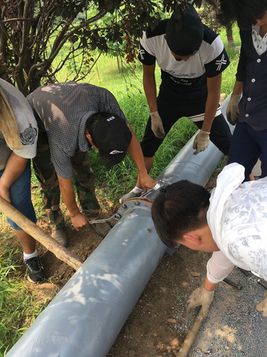 七標(biāo)項目部則在管線加壓、施工排水等方面進行了技術(shù)革新。適量減少變壓器安裝,利用大功率加壓泵和變頻電機,提高了電機的使用效率;改傳統(tǒng)的潛水泵排泄施工用水為虹吸自流排水,組裝、拆除方便快捷,便于重復(fù)用,適用性更強。這些革新都在提高工作效率的同時節(jié)約了施工成本。