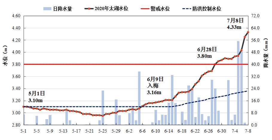中國水利網(wǎng)站7月8日訊 (通訊員 甘月云)太湖流域6月9日入梅以來,流域平均雨量達401.3毫米,較多年平均梅雨量偏多66%;今日(7月8日)8時太湖水位漲至4.33米,超過警戒水位0.53米;地區(qū)河網(wǎng)有61個水位站超警戒(27個超保證),13座大中型水庫超汛限。受降雨影響,錢塘江流域新安江水庫水位從6月19日101.61米上漲至今日的108.38米,漲幅達6.77米,已超歷史最高水位,并呈繼續(xù)上漲趨勢。
