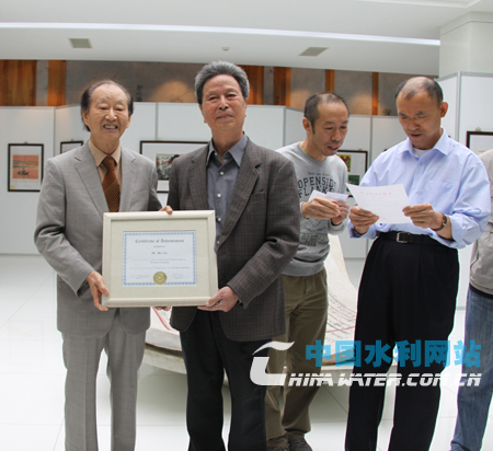 中國水利文協(xié)常務(wù)副主席譚林(右)、水利部離退休干部局黨委副書記邢志勇(左)向莫測表示祝賀