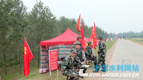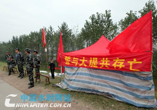 走上行洪堤,從橋口到分洪閘,大約有千米余長,排列著5個臨時搭建起來的紅色帳篷,平均200米一個。