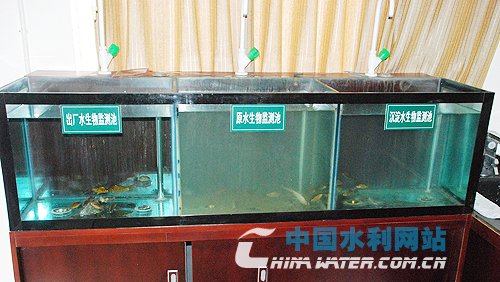 自來水六廠內(nèi)的動態(tài)監(jiān)測池,池中水循環(huán)流動,每個(gè)池子不少于9尾魚用于水環(huán)境生態(tài)監(jiān)測