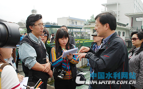 媒體團(tuán)記者在自來水六廠取水口采訪